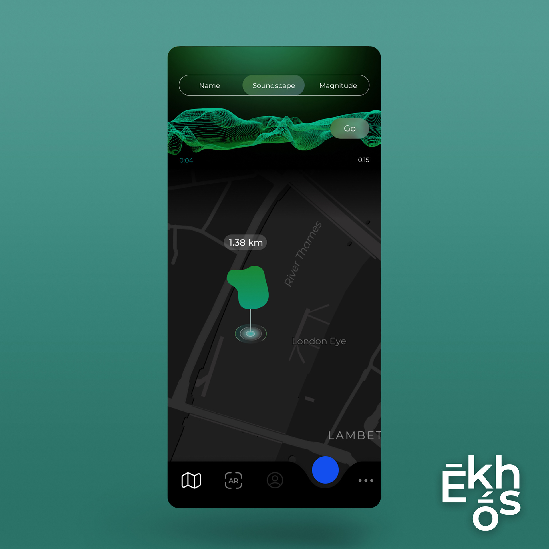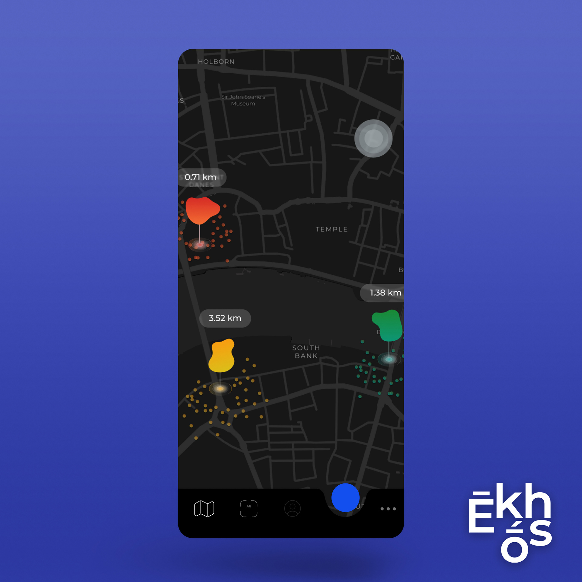 Each Ekho has a unique name, soundscape, and magnitude - based on player contributions. To contribute, players find the nearest Ekho, activate AR mode, and start dancing. The Ekho will mimic the player's movements and turn them into a multisensory performance. Ekhos is an innovative use of AR technology for artistic self-expression and body movement.